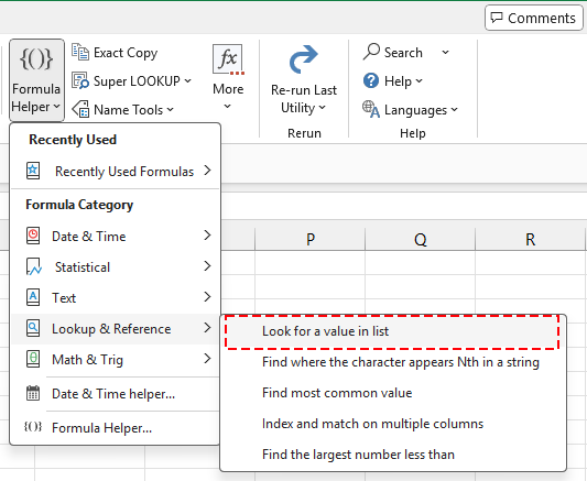 步驟 1. 在下拉列表相鄰的儲存格(例如,E2),轉到 Kutools > 公式助手 > 查找與引用 > 查找值列表。